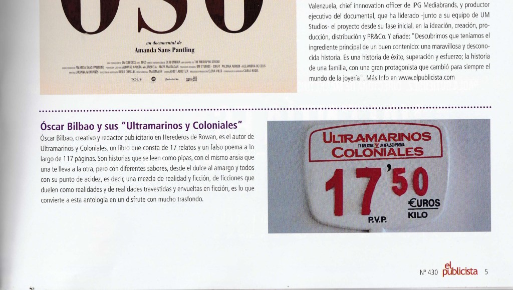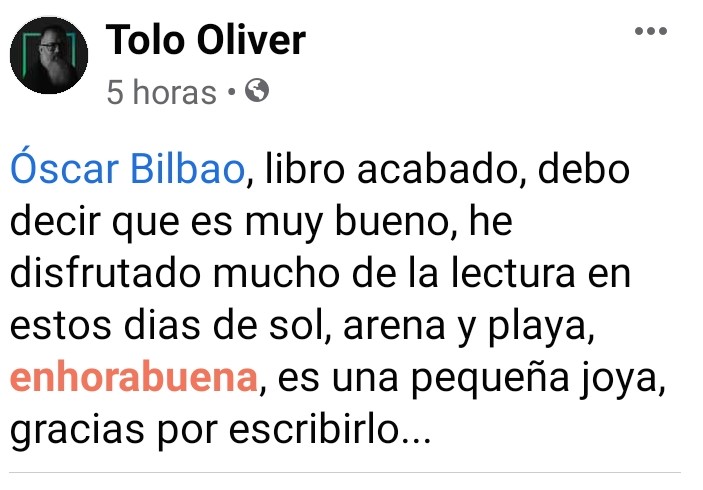 Óscar Bilbao es uno de esos tipos asquerosos que todo lo hace bien. Se casca unos anuncios que te cagas, da clases y conferencias que dices qué cabrito qué bien contado y cuánto sabe, te recomienda los mejores libros y bares y lo que mejor hace es escribir. Relatos, por ejemplo. Y ahora va y publica así a lo loco, para que quien quiera se lo descargue, una colección de historias cortitas y al pie. Yo tuve la suerte de disfrutarlas hace unos días y lo pasé muy bien. Y si vosotros lo hacéis os pasará lo mismo. Palabrita